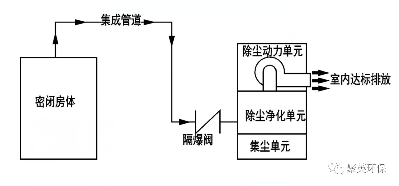 密閉房體 → 管道 → 防爆閥 → 除塵器 → 風(fēng)機(jī) → 煙囪(室內(nèi)達(dá)標(biāo)排放)