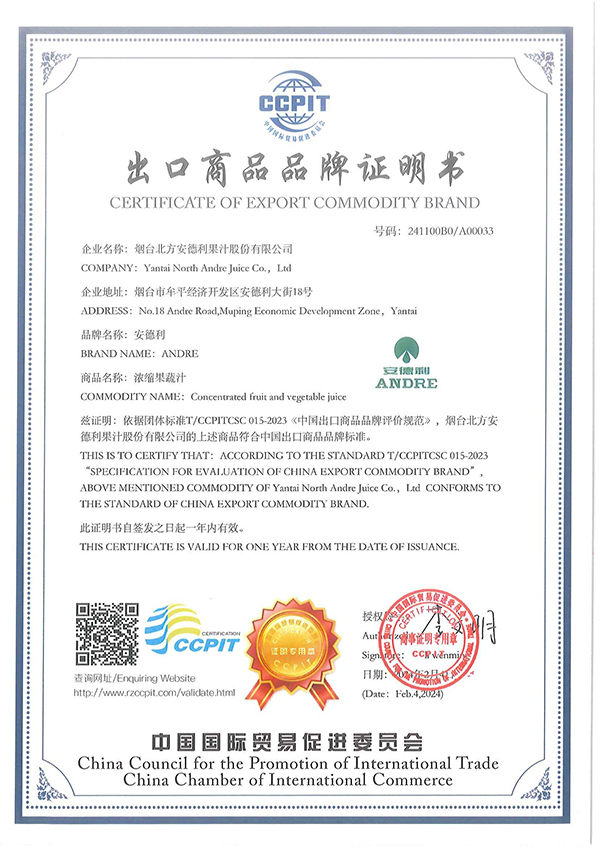 經(jīng)過中國國際貿(mào)易促進(jìn)委員會嚴(yán)格評審,安德利果汁生產(chǎn)的濃縮果蔬汁符合《中國出口商品品牌評價規(guī)范》標(biāo)準(zhǔn),公司產(chǎn)品品牌“安德利”榮獲“出口商品品牌證明書”。